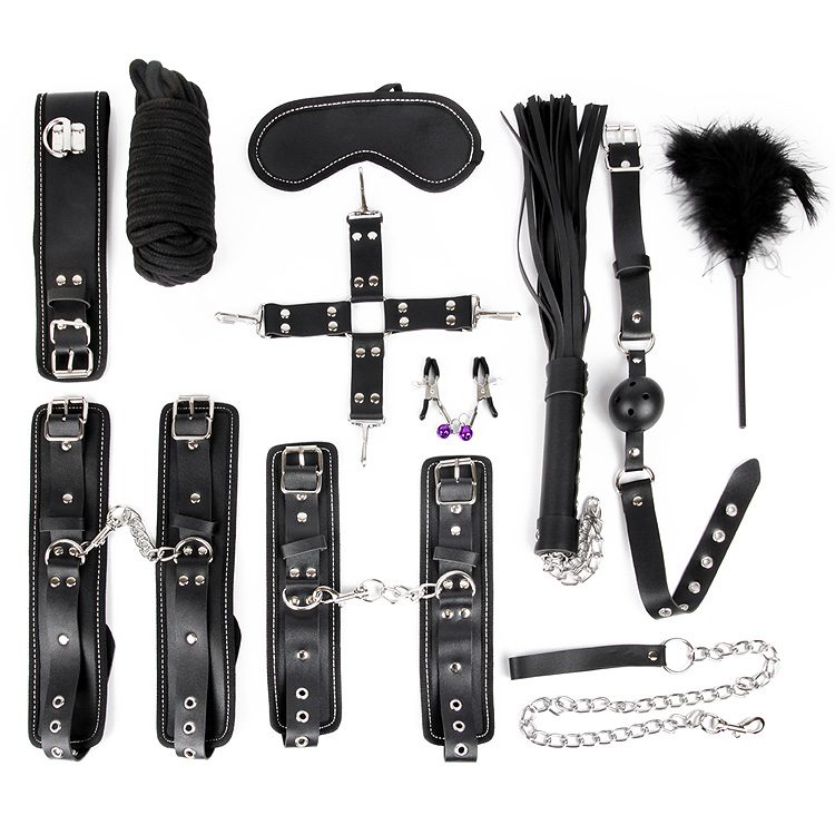 Великолепный набор аксессуаров для любителей БДСМ. В комплект входят наручники, оковы, ошейник с цепочкой-поводком, фиксатор, плеть, кляп, маска, верёвка, зажимы для сосков, щекоталка.