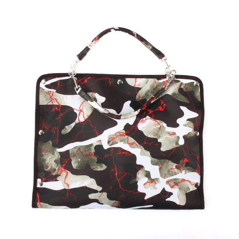 Набор комуфляжной расцветки с красной строчкой состоит из: наручников, наножников, маски на глаза, кляпа, ошейника на поводке, плети и удобного чехла для скрытого хранения аксессуаров.