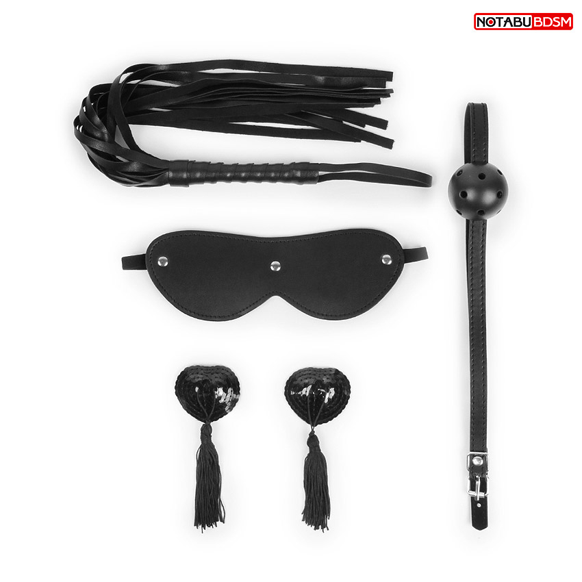 Великолепный набор аксессуаров для любителей БДСМ-игр. В комплект входят плеть, кляп, маска и пэститы для украшения сосков.