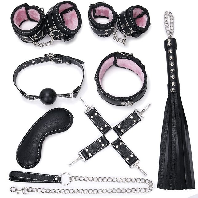 В комплект входят наручники, оковы, ошейник с цепочкой-поводком, фиксатор, плетка, кляп, маска.