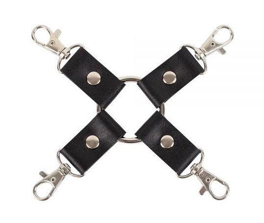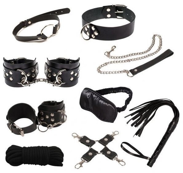 В комплекте кожаные кляп, наручники, оковы, ошейник, поводок, четырнадцати хвостая плеть, крестовой фиксатор, сатиновая маска и вервка для связывания.