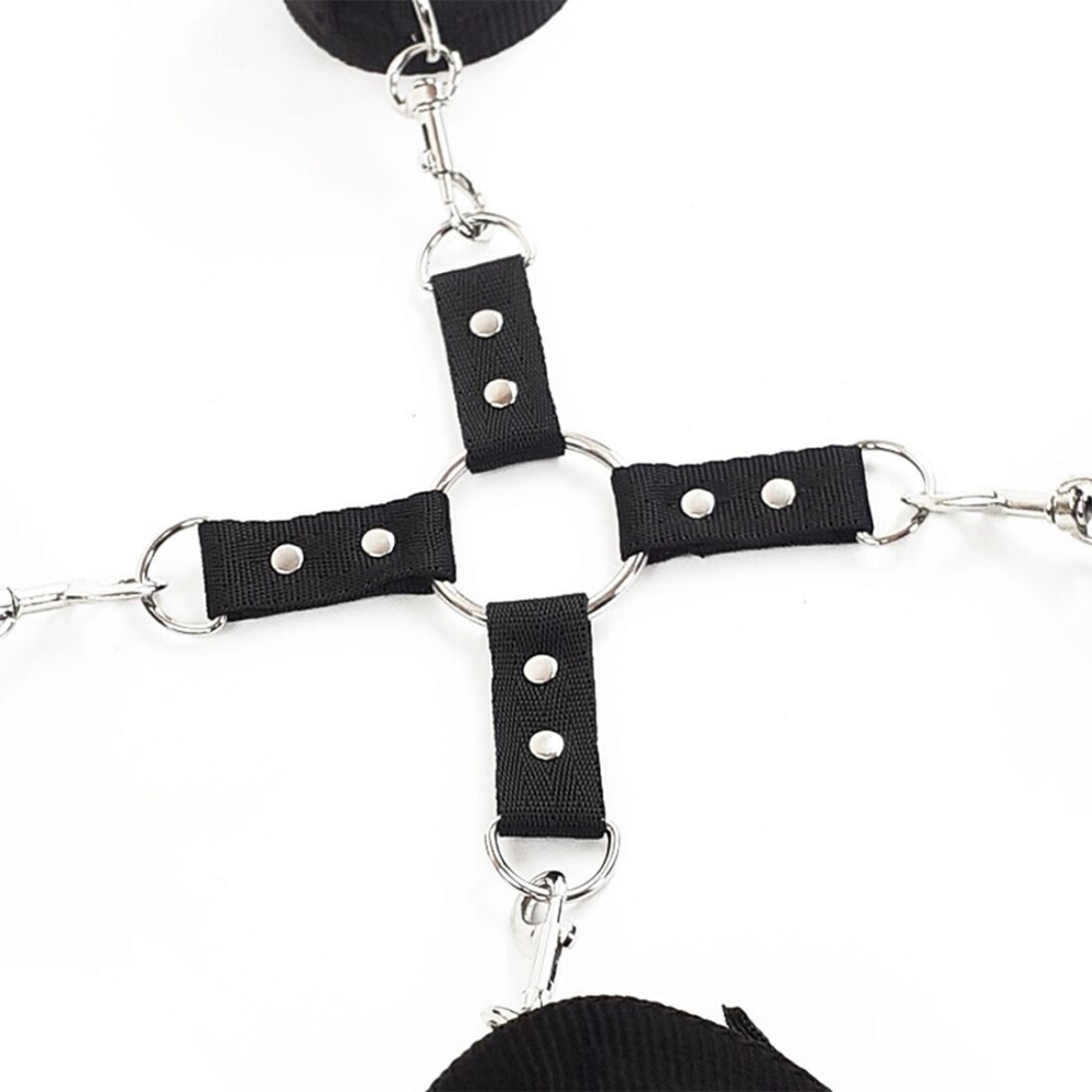 Расположите партнера на животе, заложив руки за спину и согнув ноги в коленях. Пристегните все части бондажа к кольцу и наслаждайтесь абсолютным доступом к телу, и невозможностью второй половинки двигаться и оказывать сопротивление.