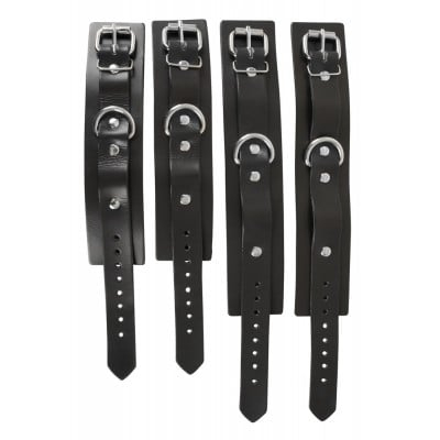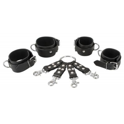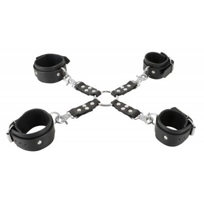 Регулируемые с помощью пряжек манжеты на запястьях и лодыжках имеют сглаженную подкладку из поролона и, как и крестовина, декоративные металлические заклепки серебристого цвета. Соединяется все с помощью вращающихся карабинов, поэтому вы можете легко разобрать и использовать отдельно или прикрепить к другим игрушкам для фиксации.