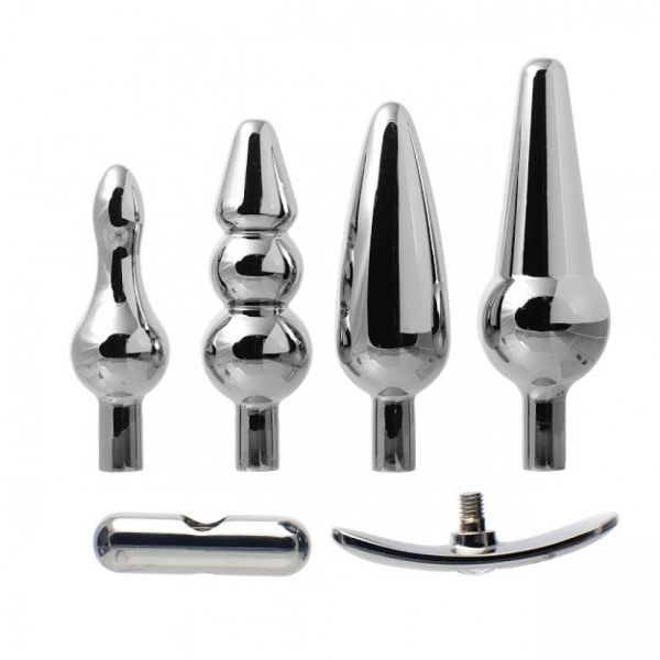 Набор состоит из четырех металлических пробок разного типа с которыми вы можете поэкспериментировать. Разнообразие форм даст вам почувствовать новые и неповторимые ощущения. Первая пробка имеет конусную форму с ярко выраженным шариком у основания, вторая - простая коническая пробка. Третья – в форме градуированной елочки. Последняя самая маленькая и изящная, поможет с легкостью начать знакомство с анальной стимуляцией. Вы можете выбрать любую из них в зависимости от вашего настроения и исследовать различные способы достижения желанного удовольствия. Пробки выполнены из нержавеющей стали, сталь быстро принимает тепло тела и невероятно гладкая. Для более ярких ощущений можно охладить или нагреть пробки в воде. В комплекте имеются две ручки на выбор, одна имеет дуговую форму, также украшена симпатичным стразиком, для сногсшибательного вида. Вторая ручка будет удобна для разнообразных манипуляций с пробками. Ручки прикручиваются с помощью специального ключа (шестигранника) и штифта с резьбой (входят в комплект). Большая пробка: длина 10 см, диаметр 3,4 см, вес 110 грамм Средняя пробка: длина 9,3 см, диаметр 2,9 см, вес 107 грамм Маленькая фигурная пробка: длина 8,7 см диаметр 2,8, вес 83 грамма Самая маленькая пробка: длина 7,6 см диаметр 2,5 см, вес 55 грамм