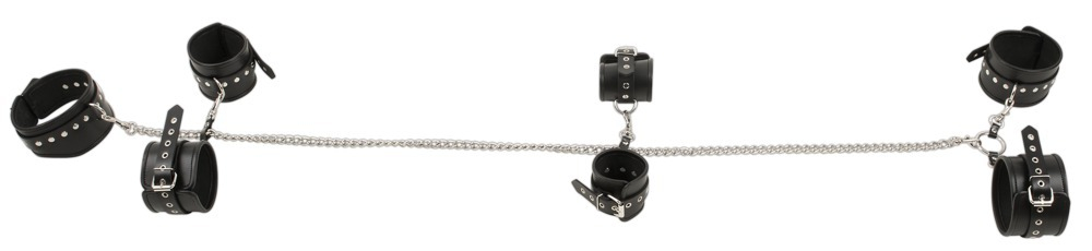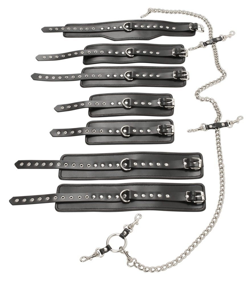 В комплект входят ошейник, 2 фиксатора на предплечья, 2 фиксатора на запястье и 2 манжеты на щиколотки, которые можно прикрепить друг к другу с помощью карабинов и металлической цепочки длиной 140 см. Ремешки для крепления фиксаторов на предплечья и на запястья двигаются по цепочке, так что манжеты можно регулировать на любой высоте.