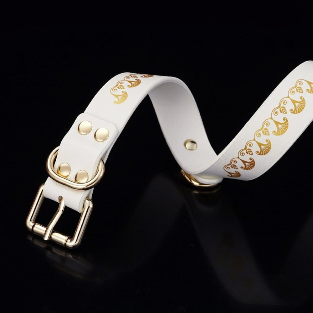 Белый цвет с золотыми акцентами придаёт комплекту роскошный вид, а качественные материалы обеспечивают комфорт и безопасность даже во время самых смелых экспериментов. Каждый элемент изготовлен из мягкой эко-кожи премиум-класса, фурнитура — из гипоаллергенного металла.