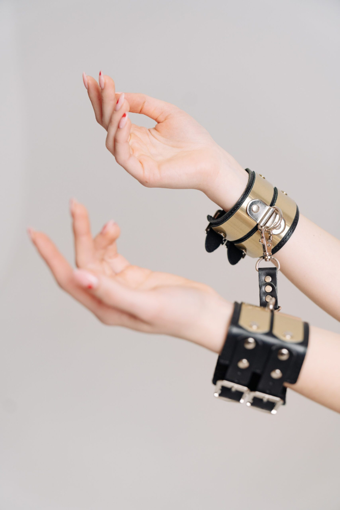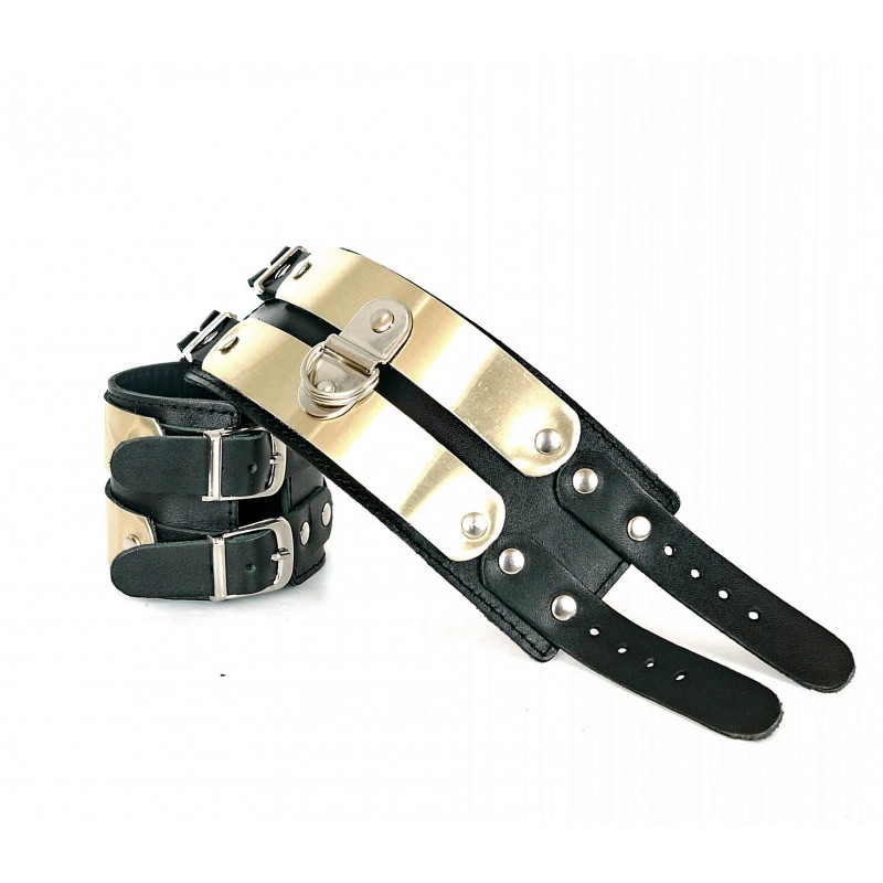 Характеристики Наручники БДСМ из натуральной кожи черного цвета с золотистыми вставками из латуни Scappa