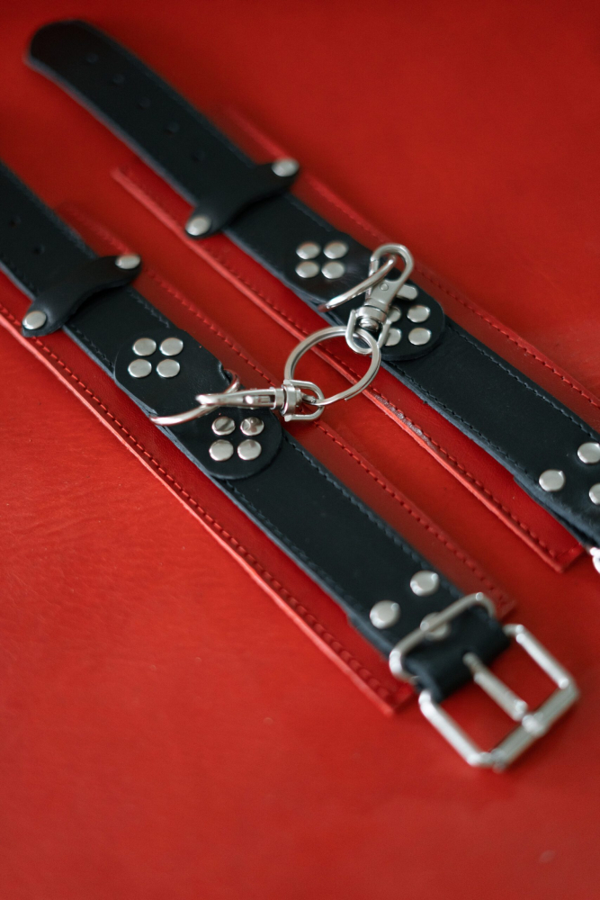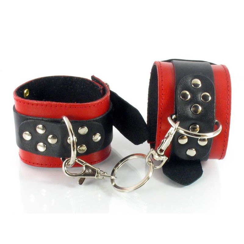 Наручники БДСМ из натуральной кожи красного цвета с черными вставками с заклепками Scappa