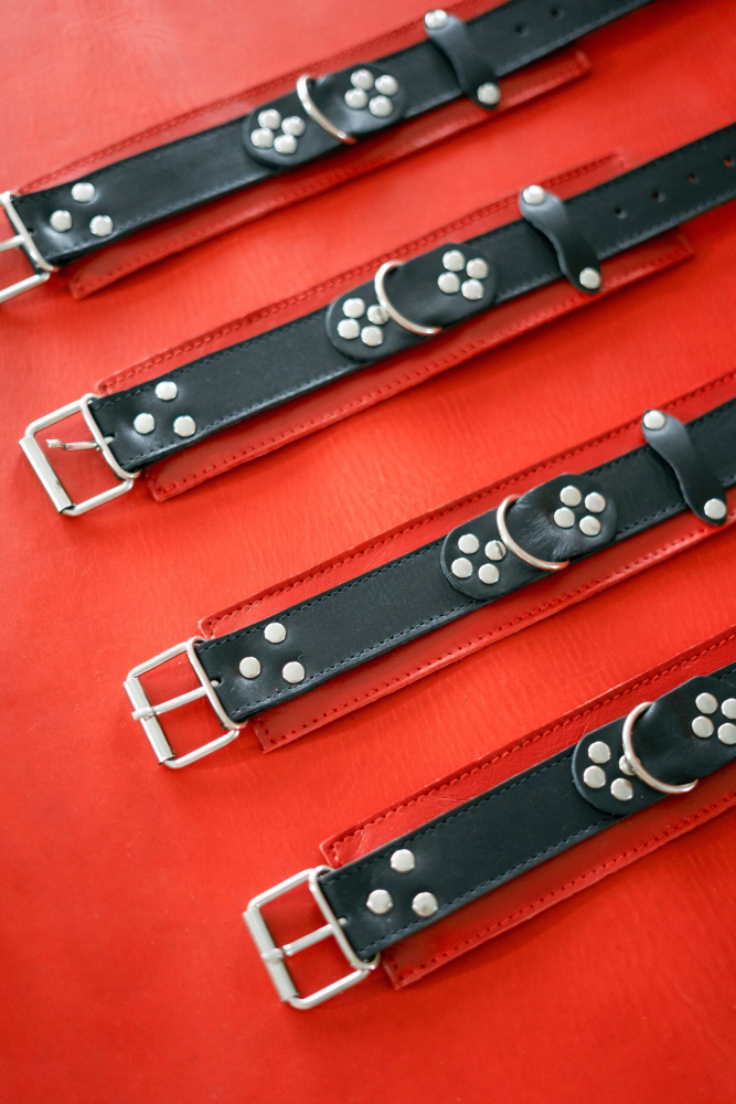 Характеристики Наручники БДСМ из натуральной кожи красного цвета с черными вставками с заклепками Scappa