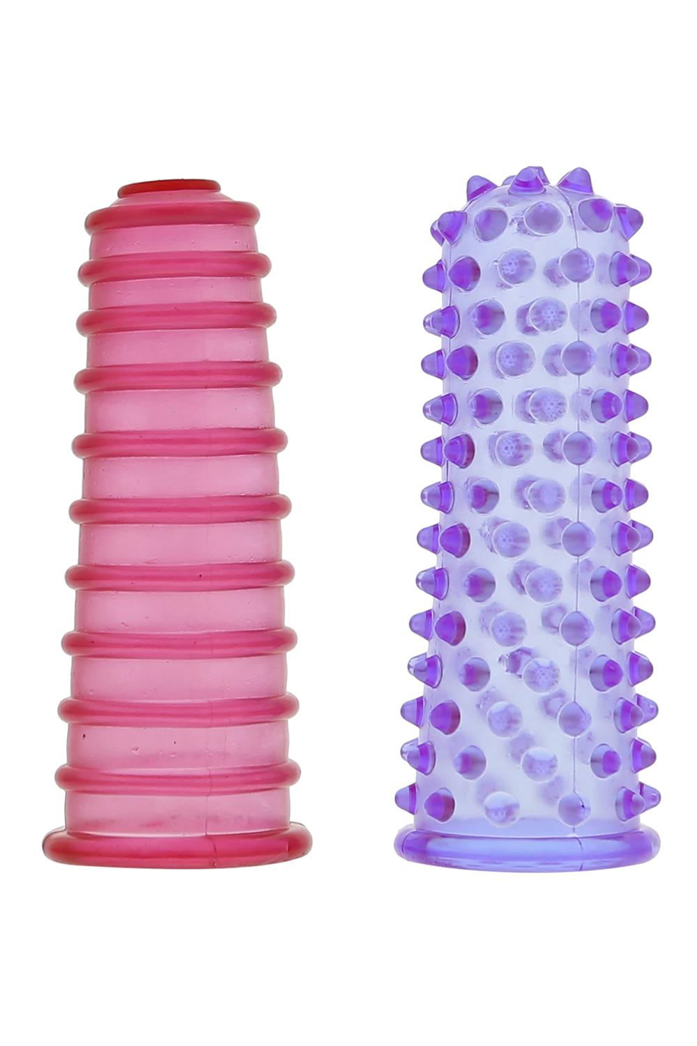 Ребристые насадки на палец красного и фиолетового цвета из мягкого, эластичного материала, просты в использовании и уходе, легко моются.