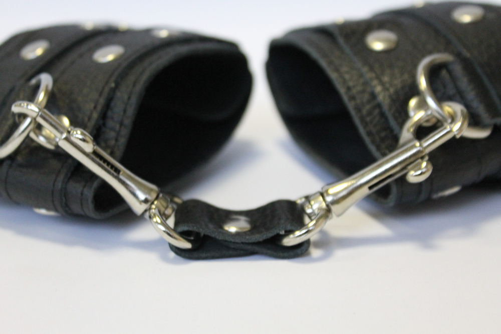 Наручники универсального размера, выполненные из натуральной кожи, с металлическими деталями и фиксацией при помощи липучек.