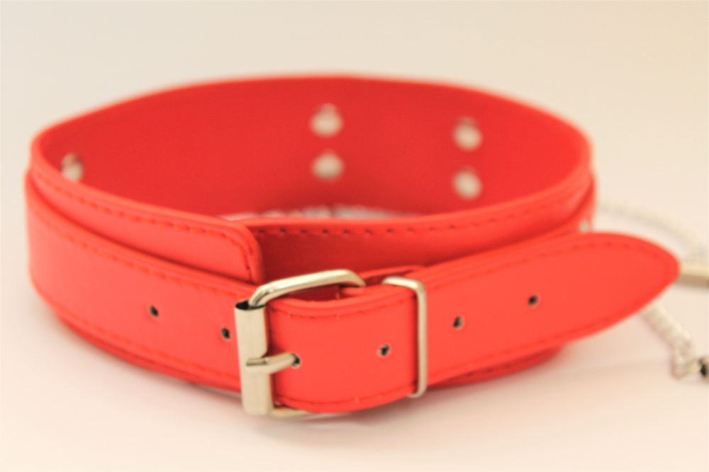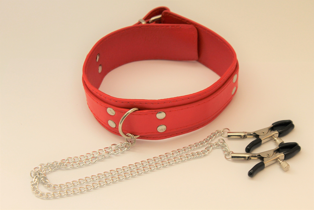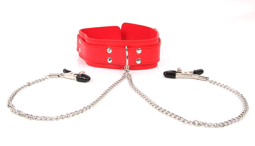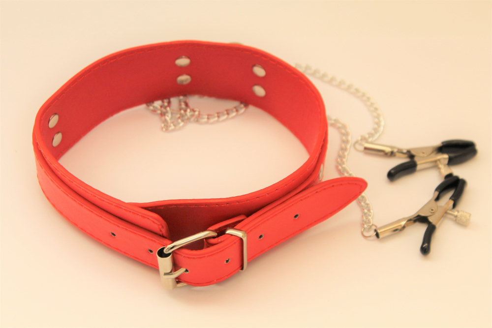 Ошейник БДСМ из экокожи с регулировкой размера и зажимы на соски с накладками Notabu красный цвет