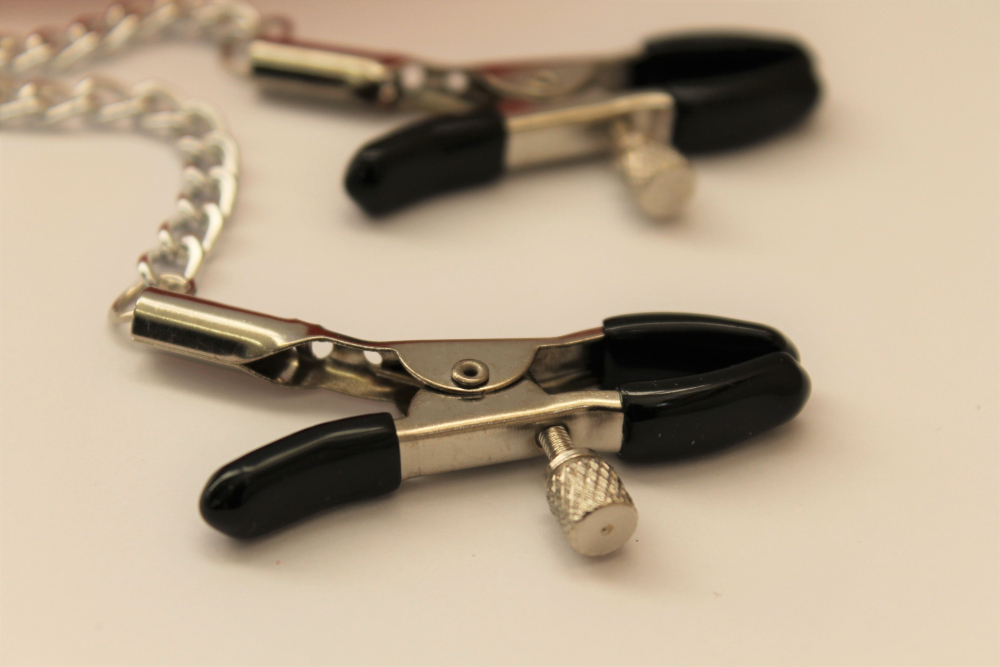 На каждом зажиме предусмотрен регулировочный винт, позволяющий контролировать силу сдавливания сосков. Зажимы прикреплены к ошейнику прочными цепочками.