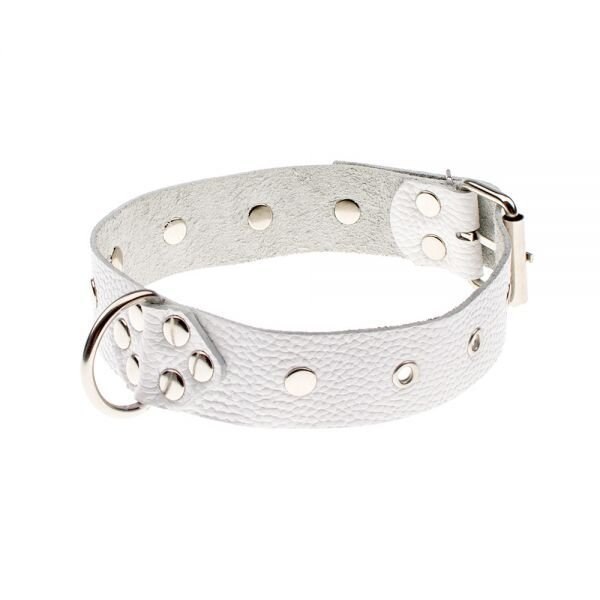 Белый ошейник ручной работы из натуральнойитальянской кожи самого высокого качества. Подкладка так же выполнена из мягкой кожи , не жмёт и не натирает. Аккуратная застежка даст возможность точно настроить размер в соответствии с диаметром шеи. Спереди атрибут снабжён полукольцом, к которому при желании можно прикрепить поводок.
