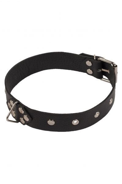 Стильный кожаный ошейник чёрного цвета. Высочайшее качество, ручная работа и элегантный дизайн. Спереди можно удобно закрепить поводок. Внутри ошейник выполнен из мягкой кожи, не жмёт и не натирает за счет того, что все крепления скрыты под подкладкой. Подарите себе и своему партнеру незабываемую игру БДСМ.