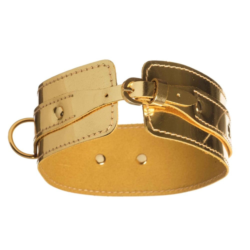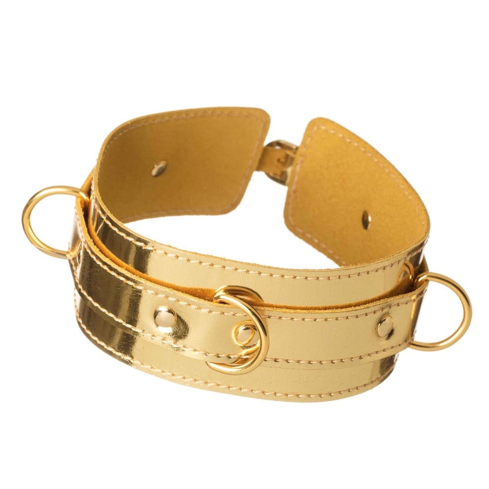 Невероятно красивы ошейник отличается исключительным дизайном и потрясающей легкостью. Девайс выполнен вручную из гибкой кожи и покрыт глянцевой золотой краской. Он отлично облегает шею и не травмирует кожу. Ошейник оформлен качественной металлической фурнитурой золотого цвета, на ремешках размещено три колечка для фиксации.