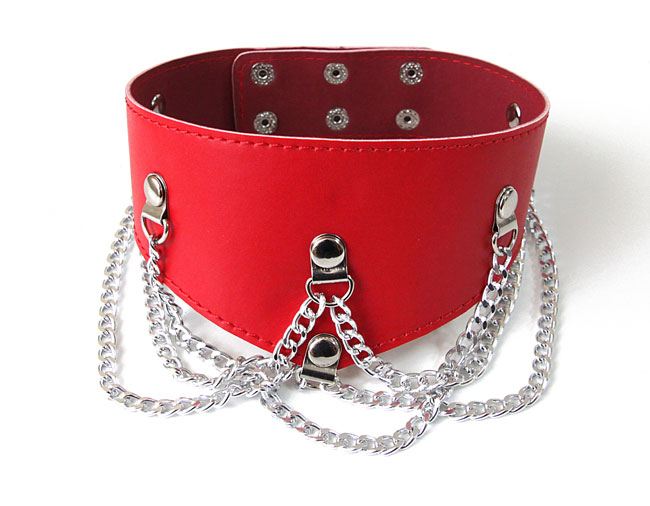 Шикарный ошейник из кожзаменителя для бурных сексуальных игр. Ошейник красный цвета с металлическими заклепками и цепочками. Шикарный аксессуар удобно сидит на шее, не натирает. Заклепки регулируют по размеру.