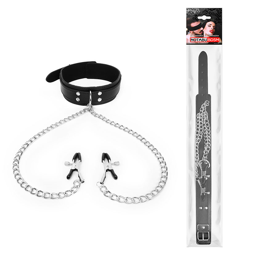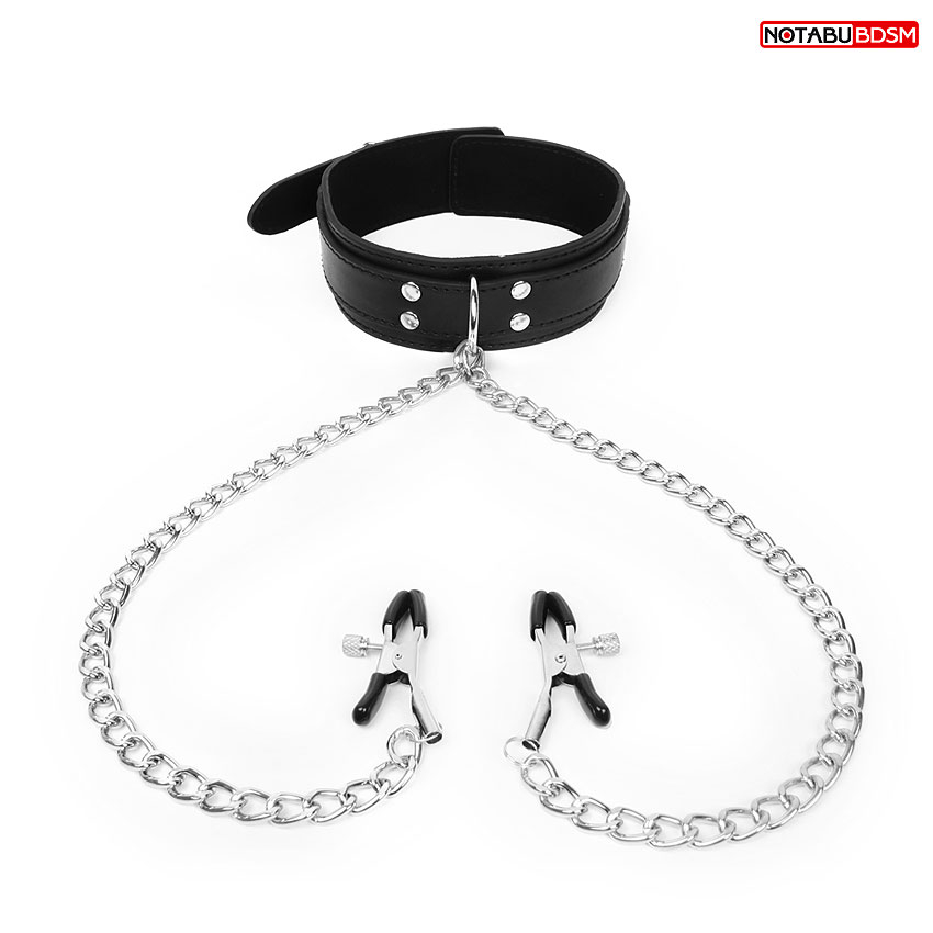 Оригинальный интимный аксессуар для любителей БДСМ-игр состоит из удобного ошейника и металлических зажимов для сосков, соединённых с ошейником прочными металлическими цепочками.