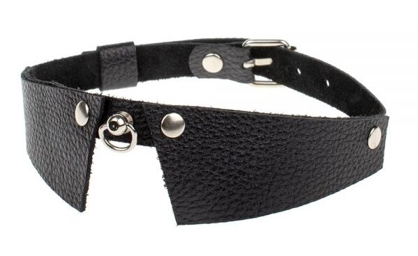 Ошейник из мягкой натуральной кожи. Украшен никелированной фурнитурой. Кольцо спереди позволяет прикрепить поводок или другой БДСМ аксессуар. На внутренней стороне ошейника нет металлических деталей, что позволяет носить его без дискомфорта длительное время.