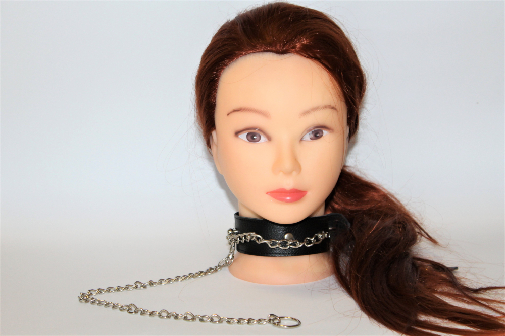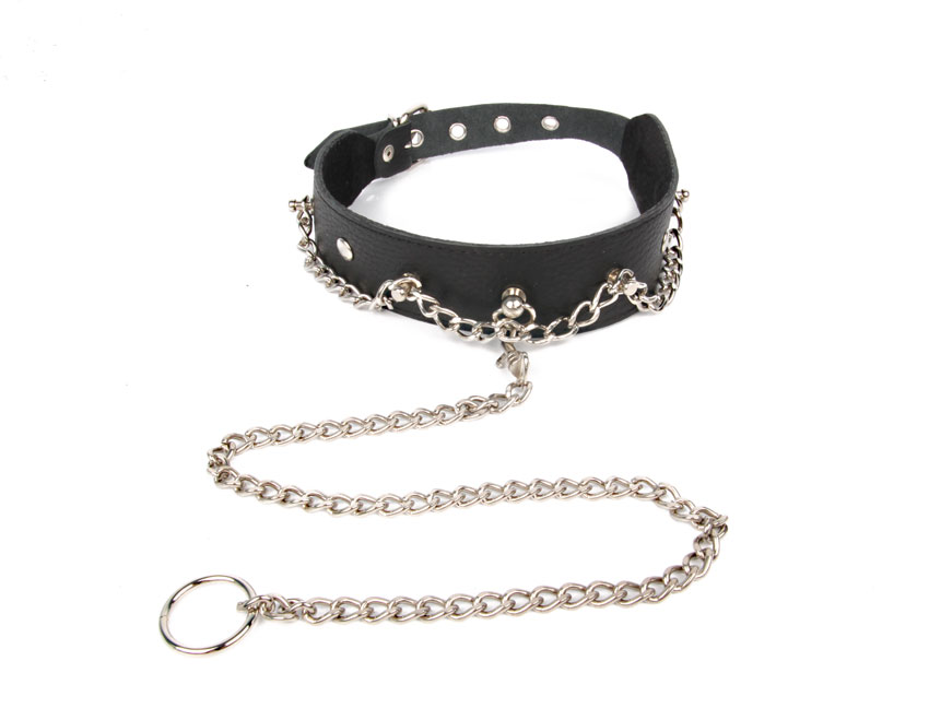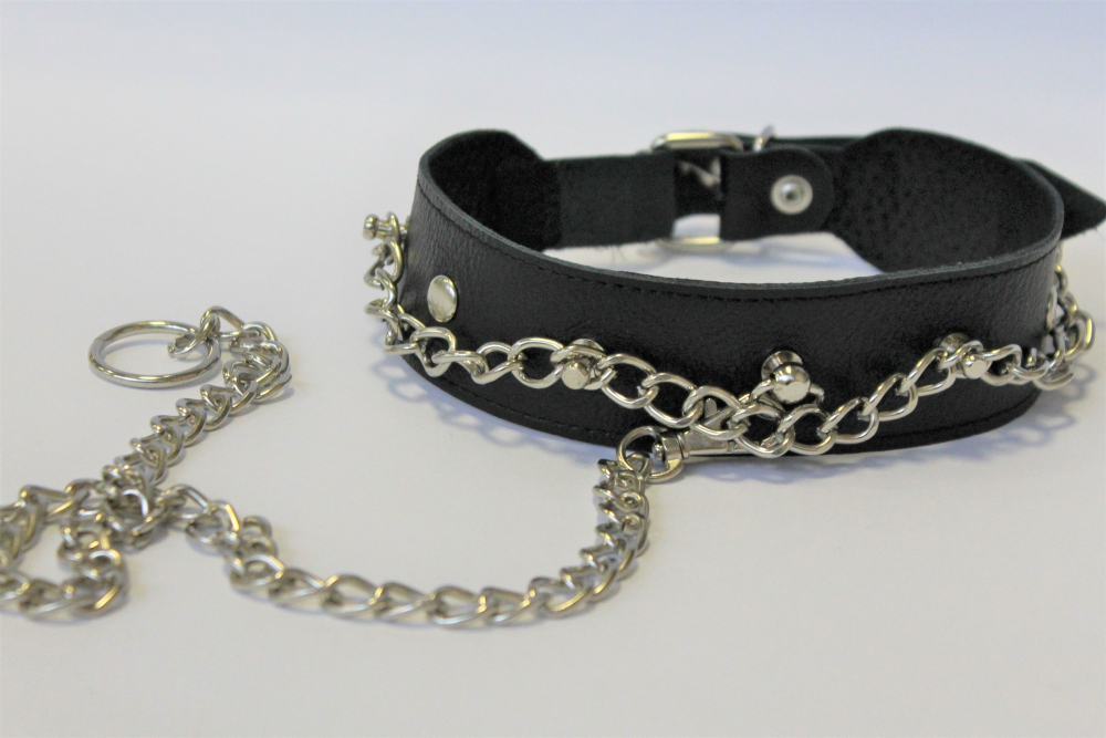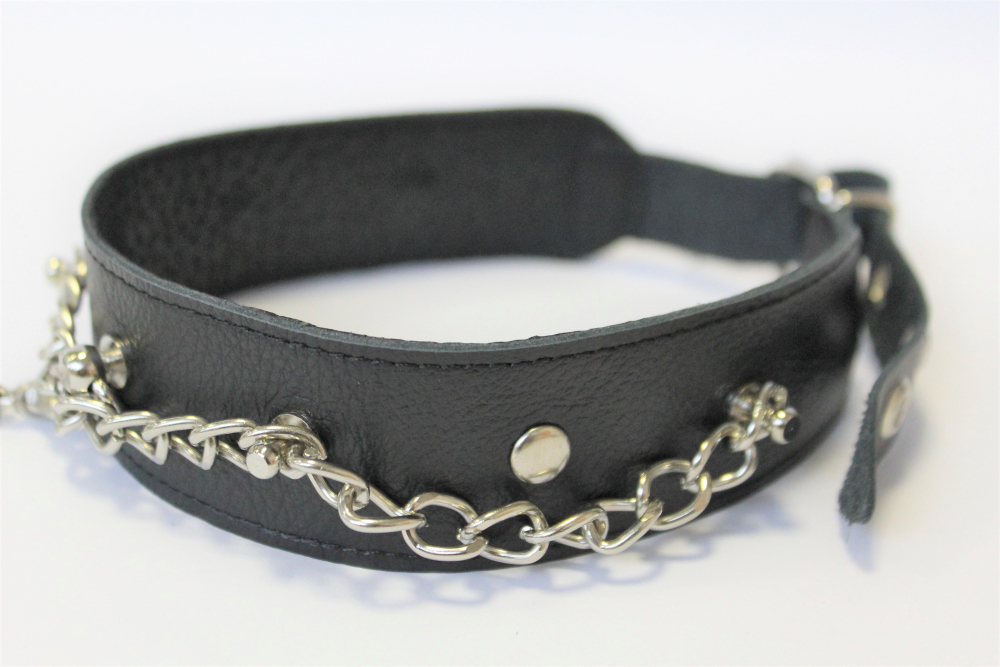 Высококачественный ошейник из натуральной кожи, универсального размера который регулируется при помощи металлических пряжек, декорированный металлическими клепками и другими элементами.