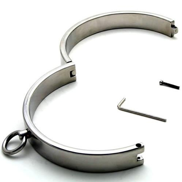 Ошейник изготовлен из нержавеющей стали. Прилагается ключ к замку. Спереди прикреплено кольцо для поводка и цепи. Внутренний диаметр 12 см., ширина 2 см., толщина 0,5 см.