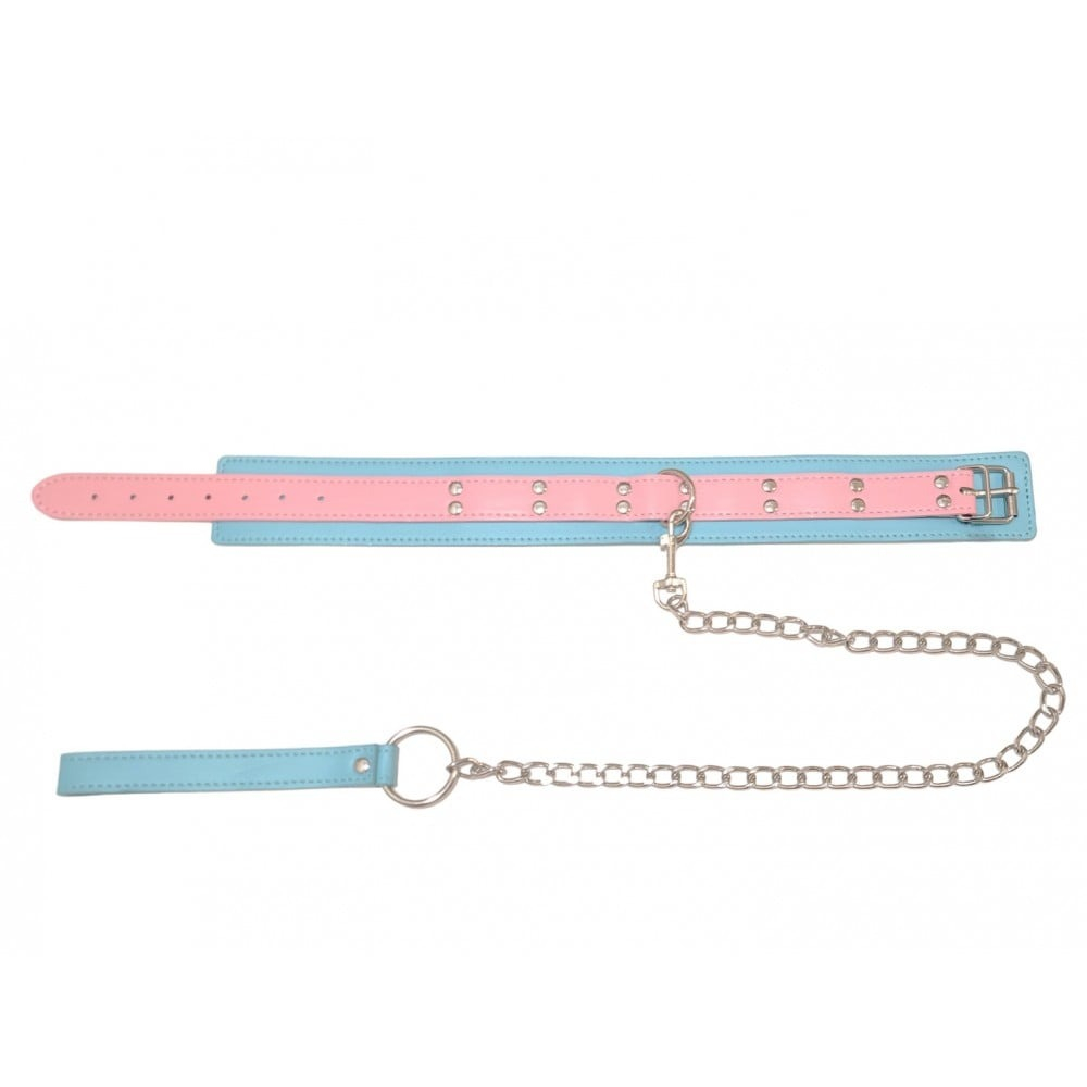 Нашийник з повідцем, шкірозамінник, блакитний з рожевим