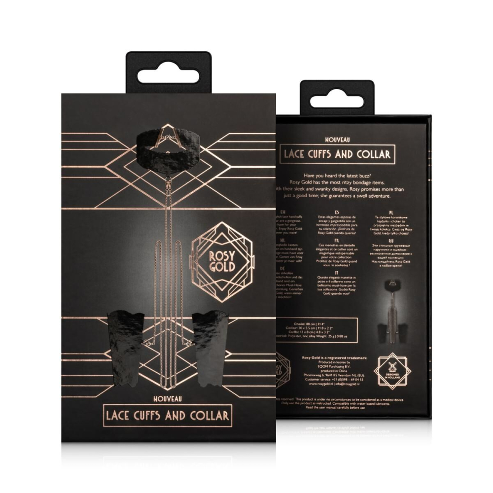 Характеристики Ошейник с поводком и с наручниками для фиксации тела из кружева черного цвета Rosy Gold Lace Cuffs and Collar