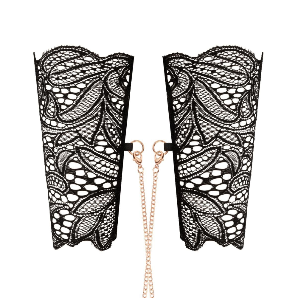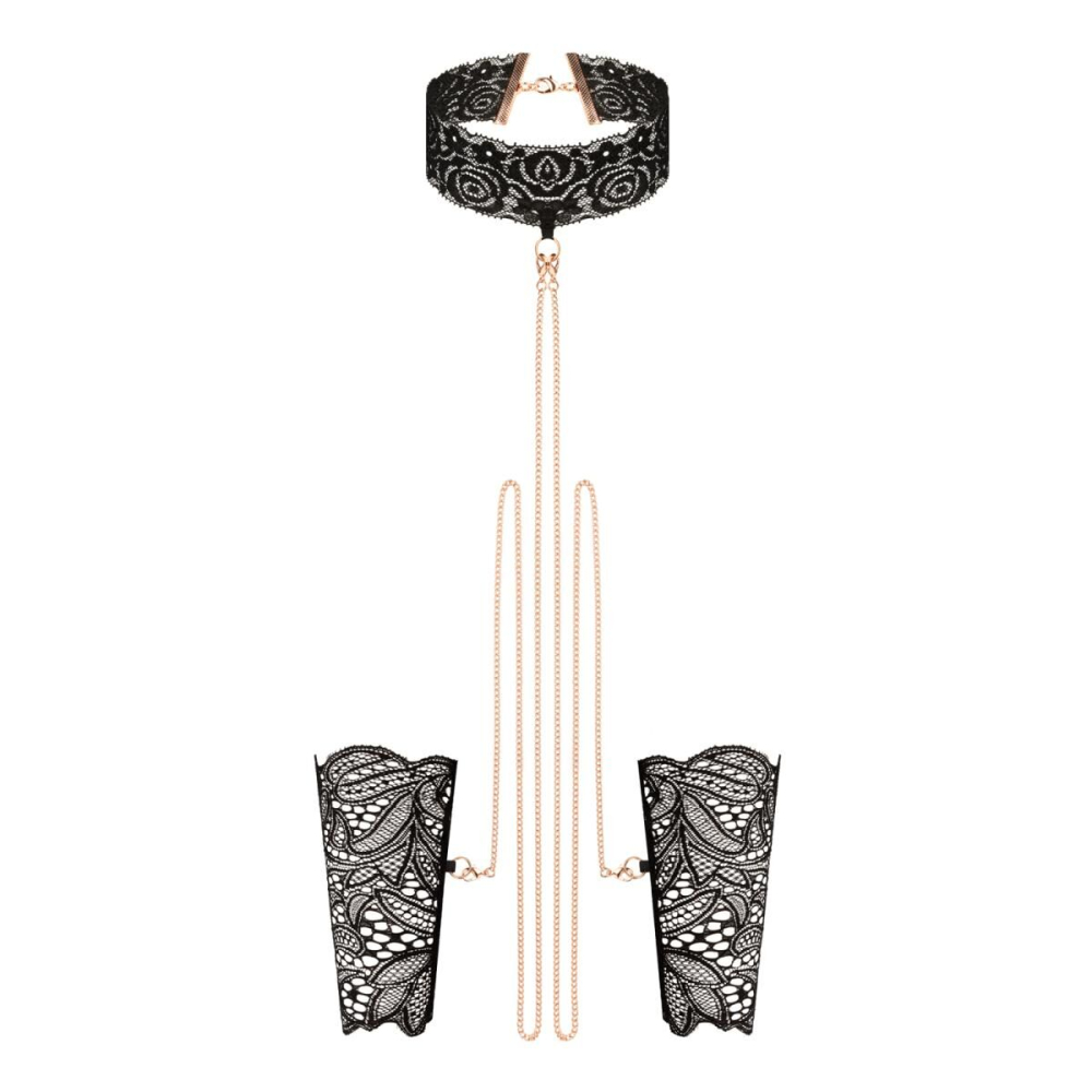 Ошейник с поводком и с наручниками для фиксации тела из кружева черного цвета Rosy Gold Lace Cuffs and Collar