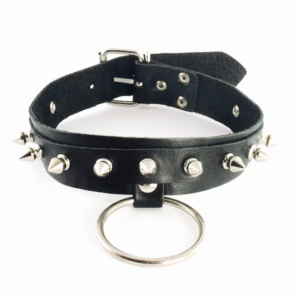 Кожаный ошейник с шипамиЦвет: красный, черныйМатериал: натуральная кожаРазмер: женщин- 36 до 41 см, чел 42 до 46 смРегулируется с помощью пряжек.