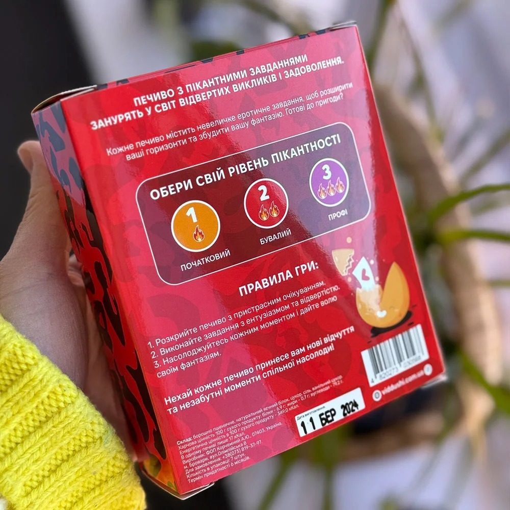 Мы создали 3 уровня пикантности, чтобы каждый получил максимум удовольствия. В каждой коробочке 7 отдельно упакованных печень с заданиями внутри.