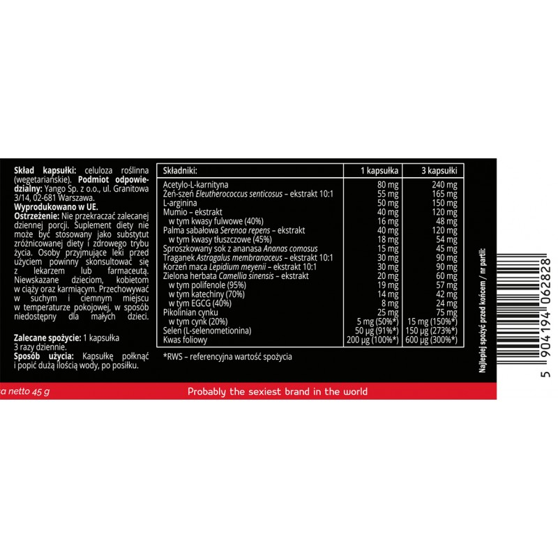 Ингредиенты: L-карнитин, экстракт женьшеня ( Eleutherococcus senticosus ) 10:1, L-аргинин, экстракт мумие ( Asphaltum ), стандартизированный до 40% фульвокислот, экстракт пальметто ( Serenoa repens ), стандартизированный до 45% жирных экстракт астрагала (Astragalus membranaceus) 10:1, экстракт корня мака (Lepidium meyenii) 10:1, экстракт зеленого чая (Camellia sinensis), стандартизированный до 95% полифенолов, 70% катехинов до 20%. состав капсул: растительная целлюлоза.