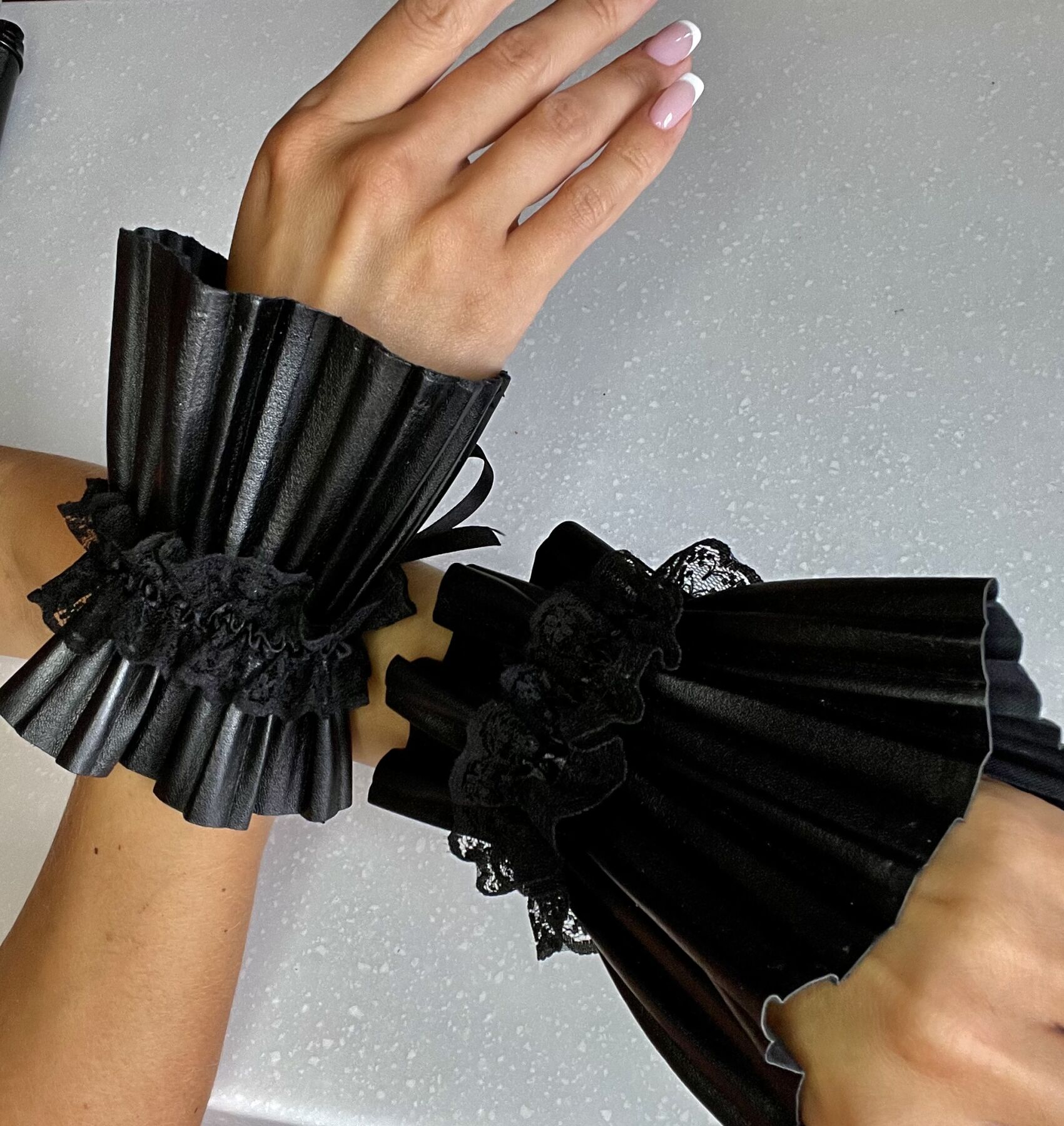 Купите плиссированные манжеты-наручники из кожзама, сделайте ваш образ заигрывающим и кокетливым, экспериментируйте!