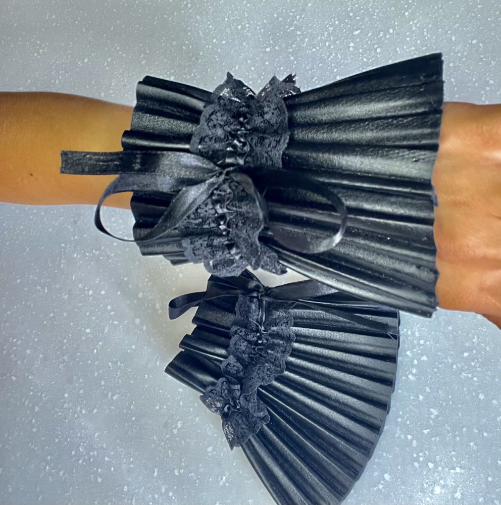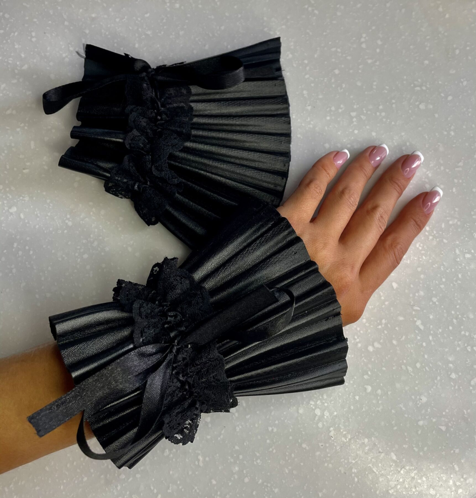 Если вы ищете изящный и необычный аксессуар, который станет элегантным дополнением вашего наряда, тогда советуем купить плиссированные манжеты-наручники из кожзама. Шикарные манжеты с атласными лентами и ажурным декором, станут очень интересным акцентом вашего образа, добавив в него капельку аристократизма.