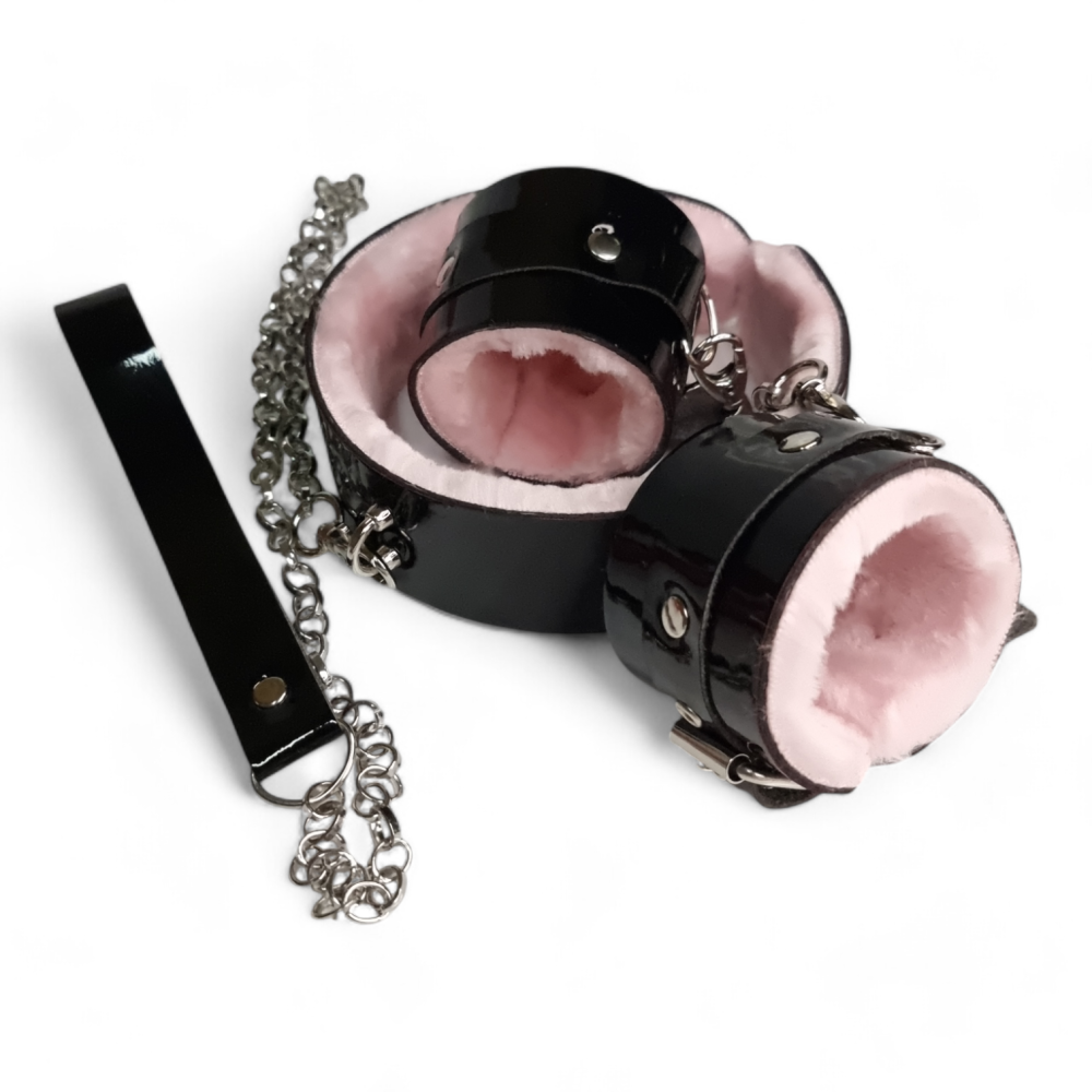 Подарочный набор для фиксации наручники и ошейник с поводком из эко лака черного цвета Flirty Collection