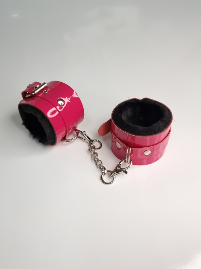 Характеристики Подарочный набор для фиксации наручники и ошейник с поводком из эко лака малинового цвета Flirty Collection