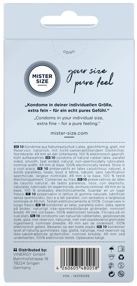 Презервативы немецкого производителя Mister Size (Мистер Сайз) являются веганскими. Темно синяя полоса на передней части упаковки равна ширине пениса под который сделан презерватив. Размер 49 рекомендуется для окружности пениса от 10 до 11 см. Вы найдете свой размер в наших презервативах. 49-й размер в продаже в упаковках по 3шт, 10шт и 36шт.