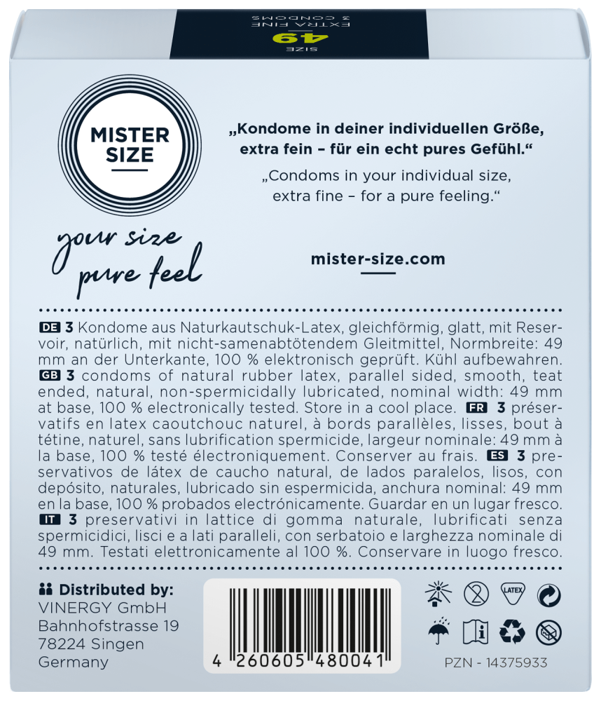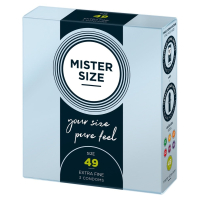 Презервативы немецкого производителя Mister Size (Мистер Сайз) являются веганскими. Темно синяя полоса на передней части упаковки равна ширине пениса под который сделан презерватив. Размер 49 рекомендуется для окружности пениса от 10 до 11 см. Вы найдете свой размер в наших презервативах. 49-й размер в продаже в упаковках по 3шт, 10шт и 36шт.