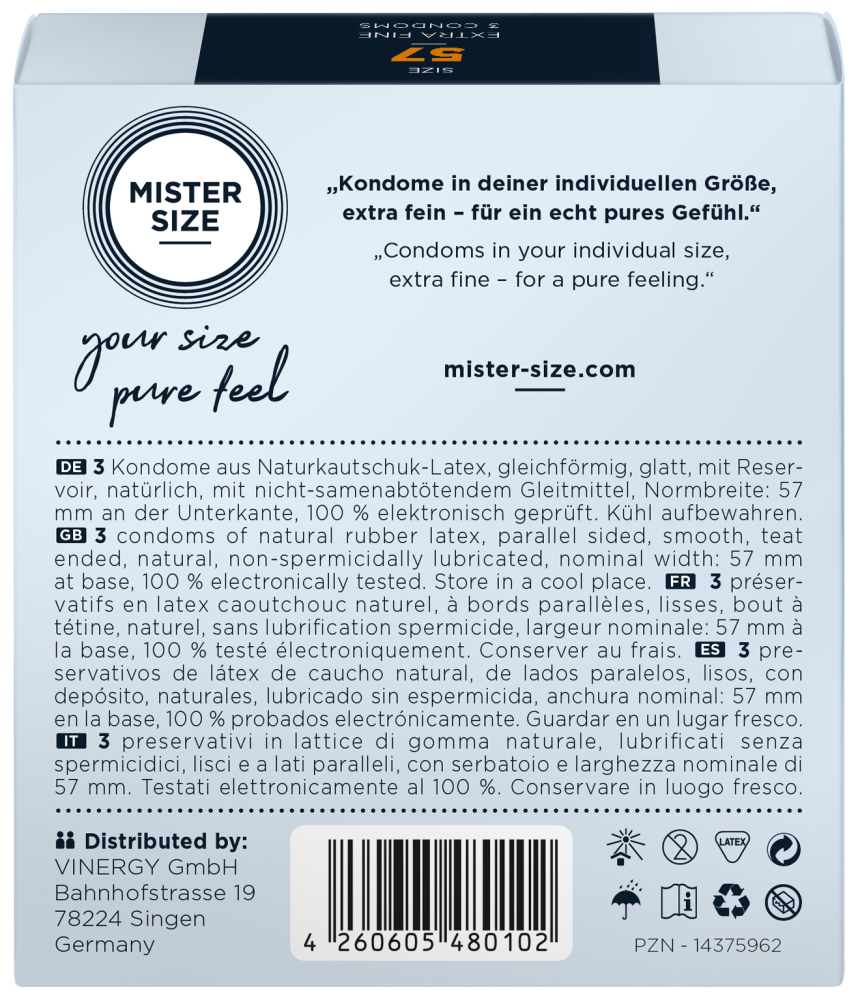 Презервативы немецкого производителя Mister Size (Мистер Сайз) являются веганскими. Темно синяя полоса на передней части упаковки равна ширине пениса под который сделан презерватив. Размер 57 мы рекомендуем от для окружности пениса от 11,5 до 12 см. Вы найдете свой размер в наших презервативах. 57-ой размер в продаже в упаковках по 3шт, 10шт и 36шт.