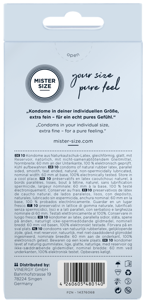 Презервативы немецкого производителя Mister Size (Мистер Сайз) являются веганскими. Темно синяя полоса на передней части упаковки равна ширине пениса под который сделан презерватив. Размер 60 рекомендуется для окружности пениса от 12 до 13 см. Вы найдете свой размер в наших презервативах. 60-й размер в продаже в упаковках по 3шт, 10шт и 36шт.