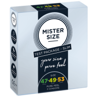 Презервативы немецкого производителя Mister Size (Мистер Сайз) являются веганскими. Темно синяя полоса на передней части упаковки равна ширине пениса под который сделан презерватив. Для того что бы определить свой индивидуальный размер просто скачайте линейку Mister Size и распечатайте на принтере.