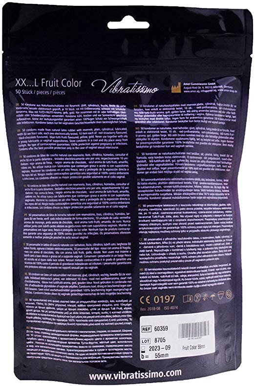 Характеристики Презервативы в цветовых вариациях с разными вкусовыми ароматами Vibratissimo XX ... L Fruit Color ширина 55 мм 50 штук