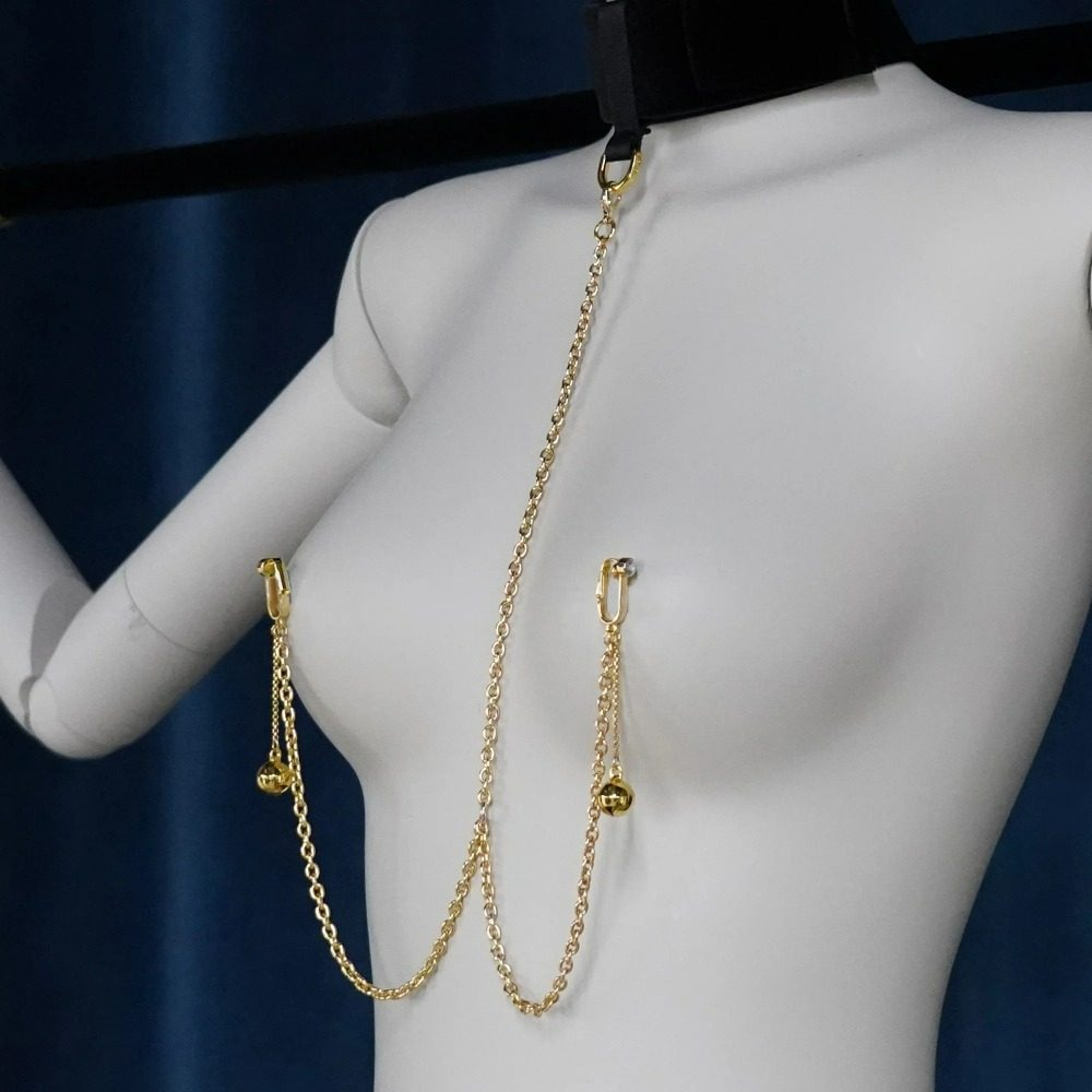 Распорка для запястий или лодыжек с ошейником и зажимами на соски с колокольчиками UPKO, черная