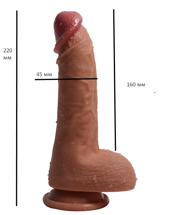 Внешне фаллос очень напоминает натуральный мужской половой член. Он имеет ярко выраженную розовую глянцевую головку, крупную набухшую венозную сетку и реалистичные яички у основания. Дополнительно игрушка оснащена мощной присоской, с помощью которой её удобно фиксировать на любой твёрдой гладкой поверхности.