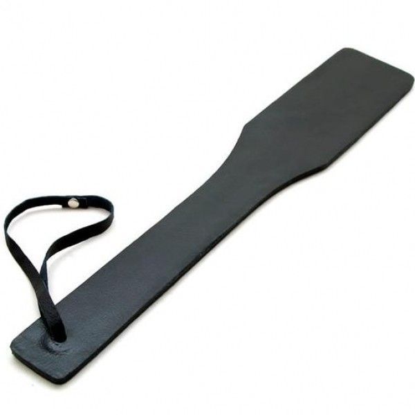 Изысканная черная шлепалка изготовлена из натуральной кожи. Она намного гибче чем деревянное весло, но все же очень упругая и жесткая. С помощью нее можно сделать очень хороший шлепок. Изготовлена из двух кусков гладкой натуральной кожи. Размеры: длина 30,5 см., ширина 5,5 см., толщина 0,4 см.