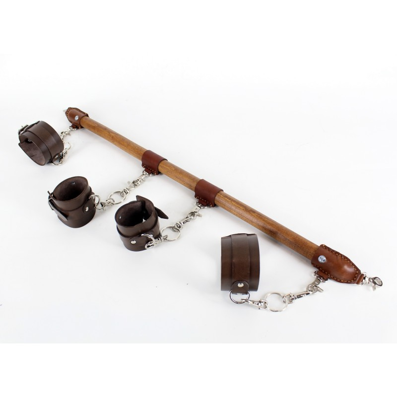 Распорка для рук и ногМатериал: дерево – бук, натуральная кожа.Наручники: ширина 6 см. Наножники: ширина 4.5 см.Размер:XS-S-M-L-XL-XXLРазмеры: длина распорки – 68,6 см