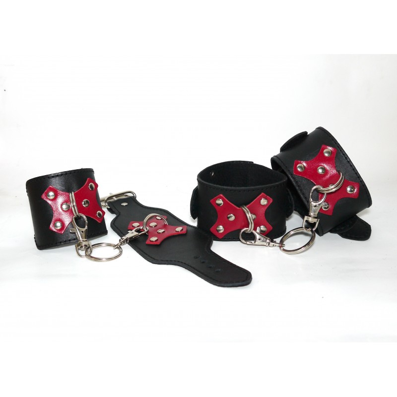 Характеристики Система фиксации БДСМ для рук и ног из натуральной кожи черного цвета с красными вставками бабочками Scappa