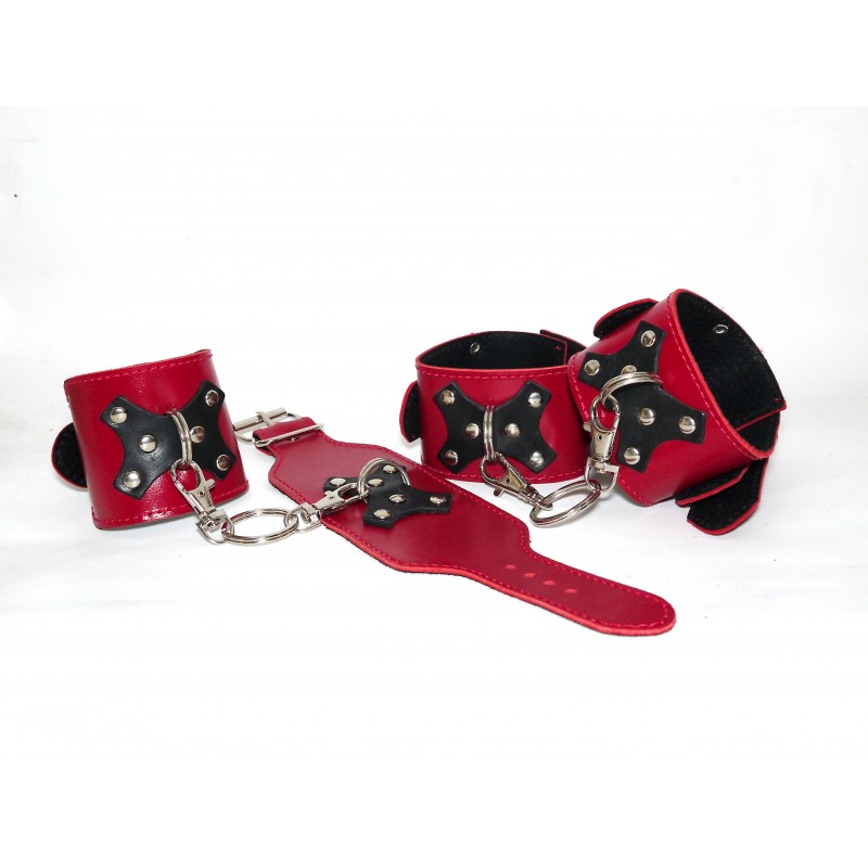 Характеристики Система фиксации БДСМ для рук и ног из натуральной кожи красного цвета с черными вставками бабочками Scappa