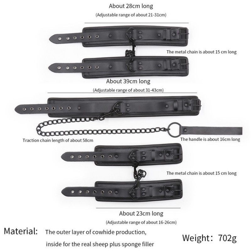 Набор бдсм аксессуаров черного цвета с черными цепями, состоит из: наруников, наножникой и ошейника с поводком.