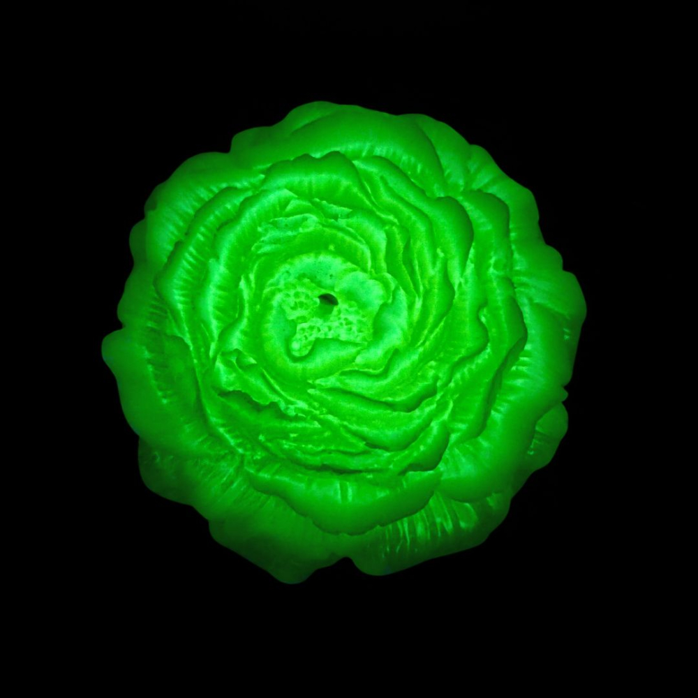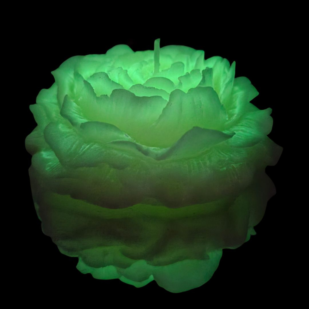 Люминесцентный эффект обеспечивает свече свечение в темноте, создавая выразительный визуальный акцент во время игры или в декоре. Температура плавления низкая и делает воск безопасным для контакта с кожей, позволяя использовать его в wax play. Тонко прорисованные лепестки придают изделию реалистичность, а мягкое пламя усиливает атмосферу.