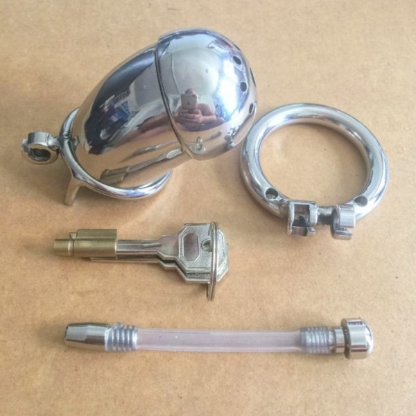 Матеріал: нержавіюча сталь 304. Розмір: приблизно 7,8 см завдовжки, 32 мм у діаметрі. Довжина катетера 8 см, 8 мм у діаметрі. Діаметр кільця лише 3 розмірів, 40 мм, 45 мм, 50 мм. За замовчуванням відправлено кільце діаметром 45 мм. Вага: 230 г Пояс вірності для чоловіків значно відрізняється від жіночого. Хоча й є такі ж види білизни як і у жінок. Зазвичай пояс вірності для чоловіків є клітиною для пеніса. Виготовляється із пластмаси або нержавіючої медичної сталі. Пояс вірності чоловікам може використовуватися як надійний фіксатор чоловічого пеніса для психологічного заспокоєння жінок. Адже для жінок головне, щоб мужик не ходив набік. Також може бути використано як атрибут для сексуальних ігор. Експериментувати можна по-різному, головне включити уяву. Надійно закріпивши пояс вірності можна зафіксувати за допомогою замочка, а ключик сховати в надійному місці, і змусити чоловіка заслужити його. Не вимагає особливого догляду за конструкцією, достатньо промити під проточною водою з милом. У зв'язку з тим, що не відноситься не до одного з американських і європейських брендів, не має барвистої дорогої упаковки і витрат на маркетинг, це координально скорочує витрати на виробництво і логістику даної продукції по всьому світу, що дає в результаті відносно невисоку вартість кінцевого споживача, при високій якості самої продукції.